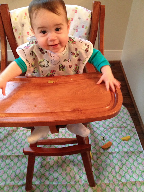 The Splat Mat is a relatively new addition to our house and I'm in love with it. I just put it down underneath her high chair and it catches (most of) the food she throws. Anything that doesn't make it on the mat gets thrown out, but most of it I am able to put back on her tray for her to try to eat. It is made out of the same material as the bibs and is a breeze to clean. I usually wipe it down with an antibacterial wipe after each meal and then throw it in the washer once a week. Easy breezy - an A+ in my book!